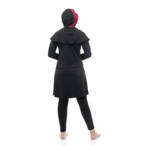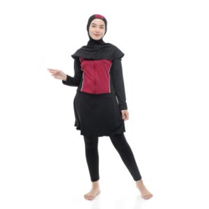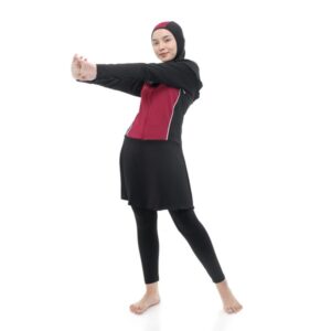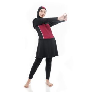 Baju renang muslimah oneset terdiri baju atasan renang muslimah, celana renang panjang dan hijab. Material nylon warna hitam yang dimix dengan warna maroon dirancang comfort stretch dapat bebas bergerak di dalam air.