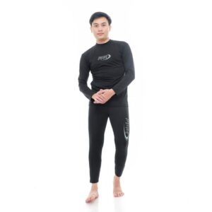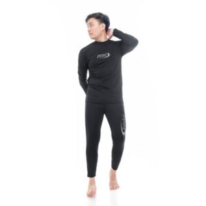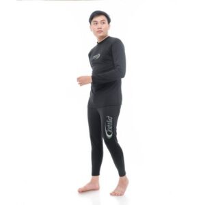 Setelan renang panjang pria dewasa polos warna hitam, terdapat sablon logo di baju bagian depan, dan di bagian paha kanan celana. one sets berbahan Nylon spandek premium quality, terdapat tali bagian pinggang celana memudahkan anda untuk menyesuaikan sesuai ukuran pinggang. di rancang confort strech dapat bebas bergerak dalam air.